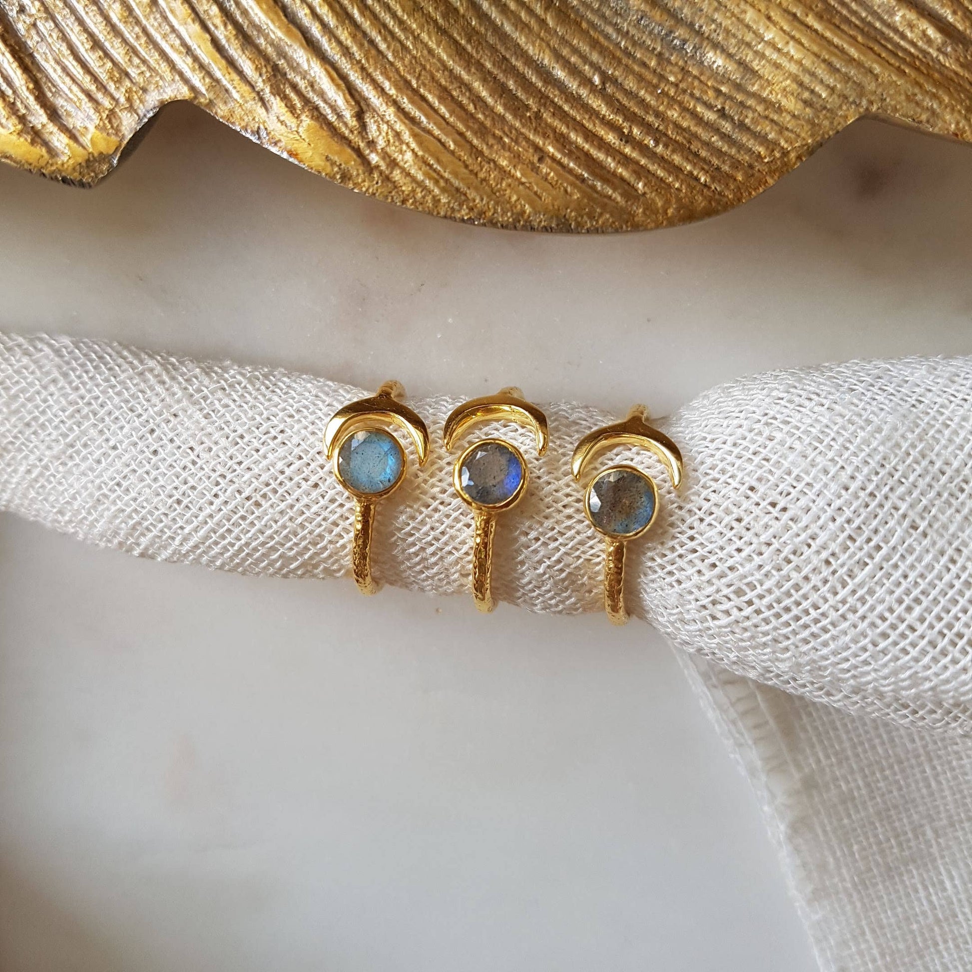El Anillo Lune es una pieza luminosa y minimalista, creada como talismán de protección y claridad interior. Ajustable de la talla 54 a la 60, combina un acabado martillado artesanal con una piedra natural de labradorita luna suave, que aporta textura, brillo y carácter único.