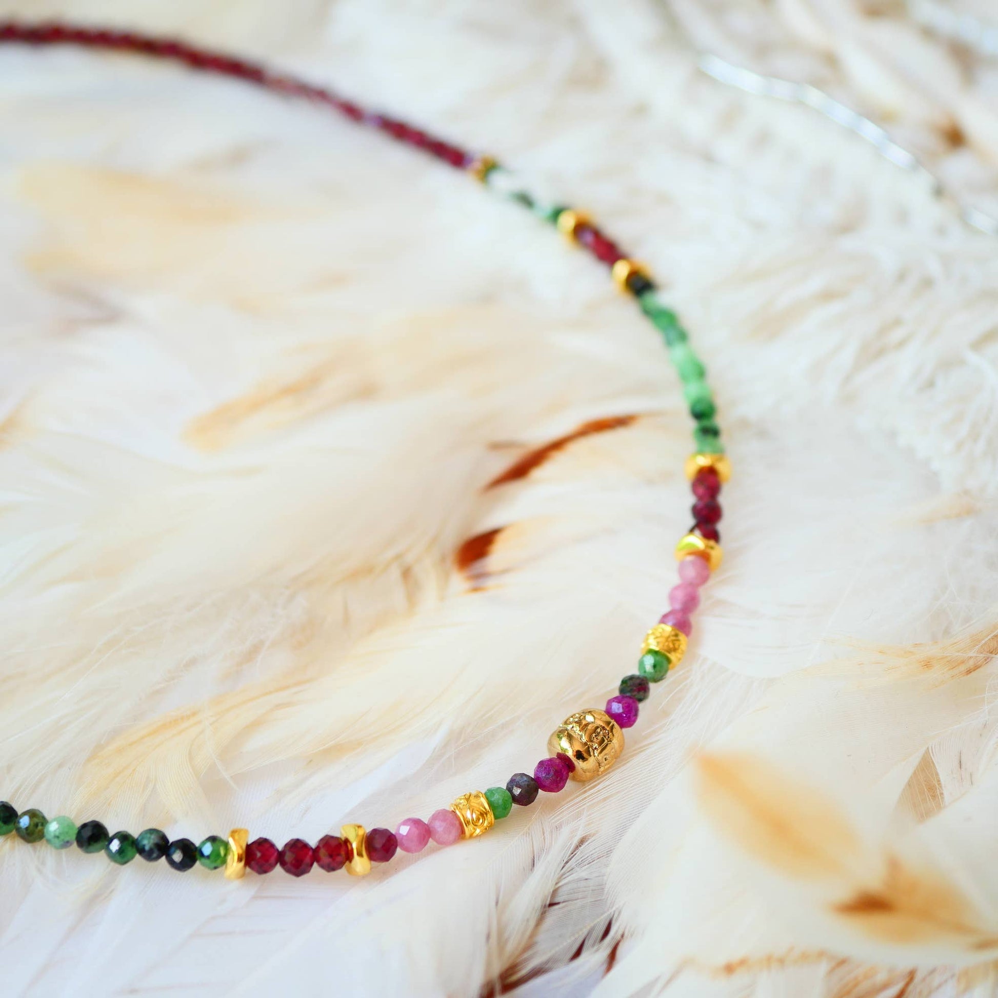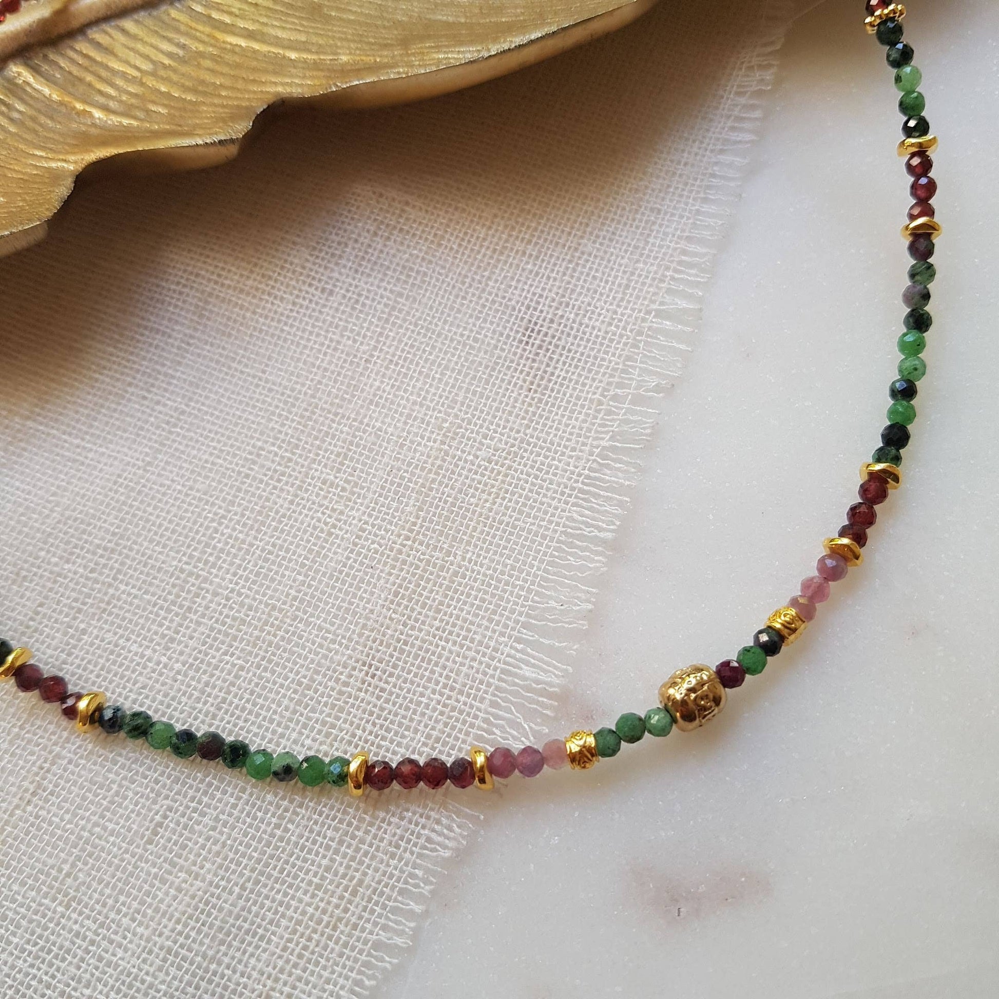 El Collar Talia combina elegancia, color y energía en una pieza única. Elaborado en acero inoxidable dorado, mide 40 cm + 5 cm de extensión y está compuesto por granate, rubí zoisita y turmalina rosa, creando un diseño bohemio sofisticado y lleno de vida.