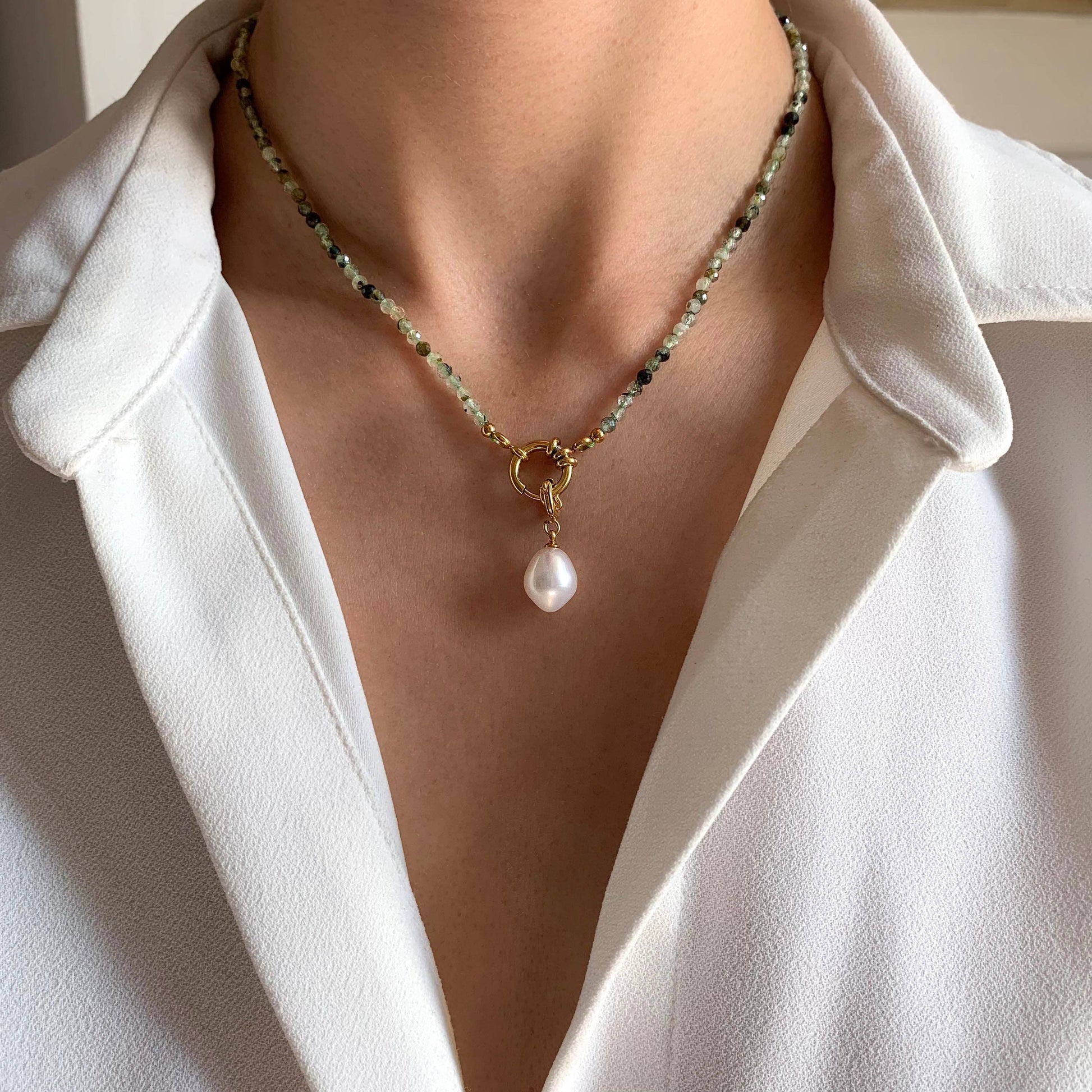 Femenino, fresco y elegante, este collar de Prehnita natural combina la suavidad de las piedras verdes con la luminosidad de una perla de agua dulce. Su diseño incluye un cierre delantero de acero inoxidable, resistente al agua, que añade un toque moderno y práctico.