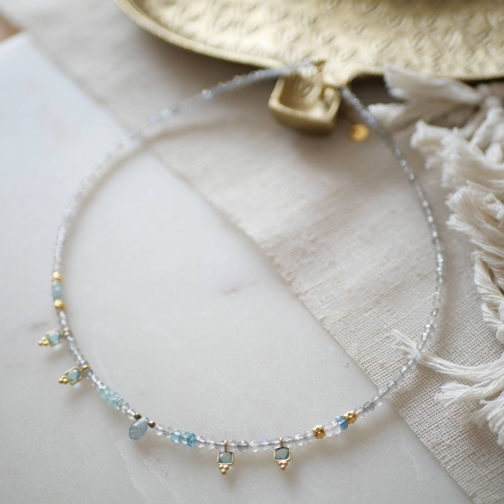 Collar artesanal de acero inoxidable con delicados dijes centrales de aguamarina, labradorita, morganita y apatita dorada. Una pieza luminosa y equilibrada que combina piedras naturales en tonos suaves y detalles dorados, ideal para aportar frescura y elegancia a cualquier look.
