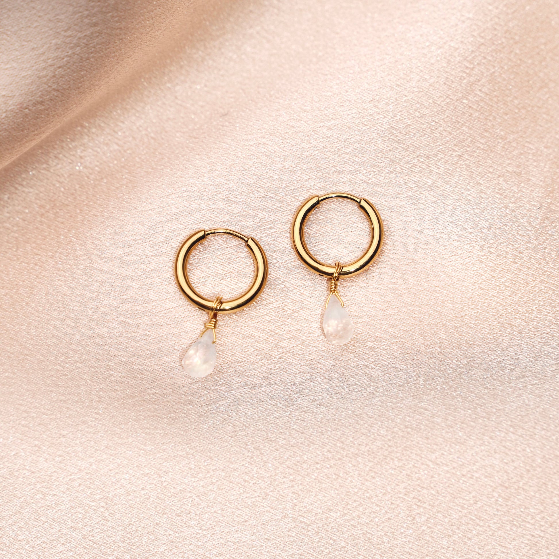 Elegantes y minimalistas, estos pequeños aros de acero inoxidable presentan delicados colgantes en forma de gota de cuarzo cristal, aportando un toque moderno y sofisticado a cualquier look. Ideales para llevar de día o de noche, su diseño atemporal los convierte en un accesorio imprescindible. El precio corresponde a un par.