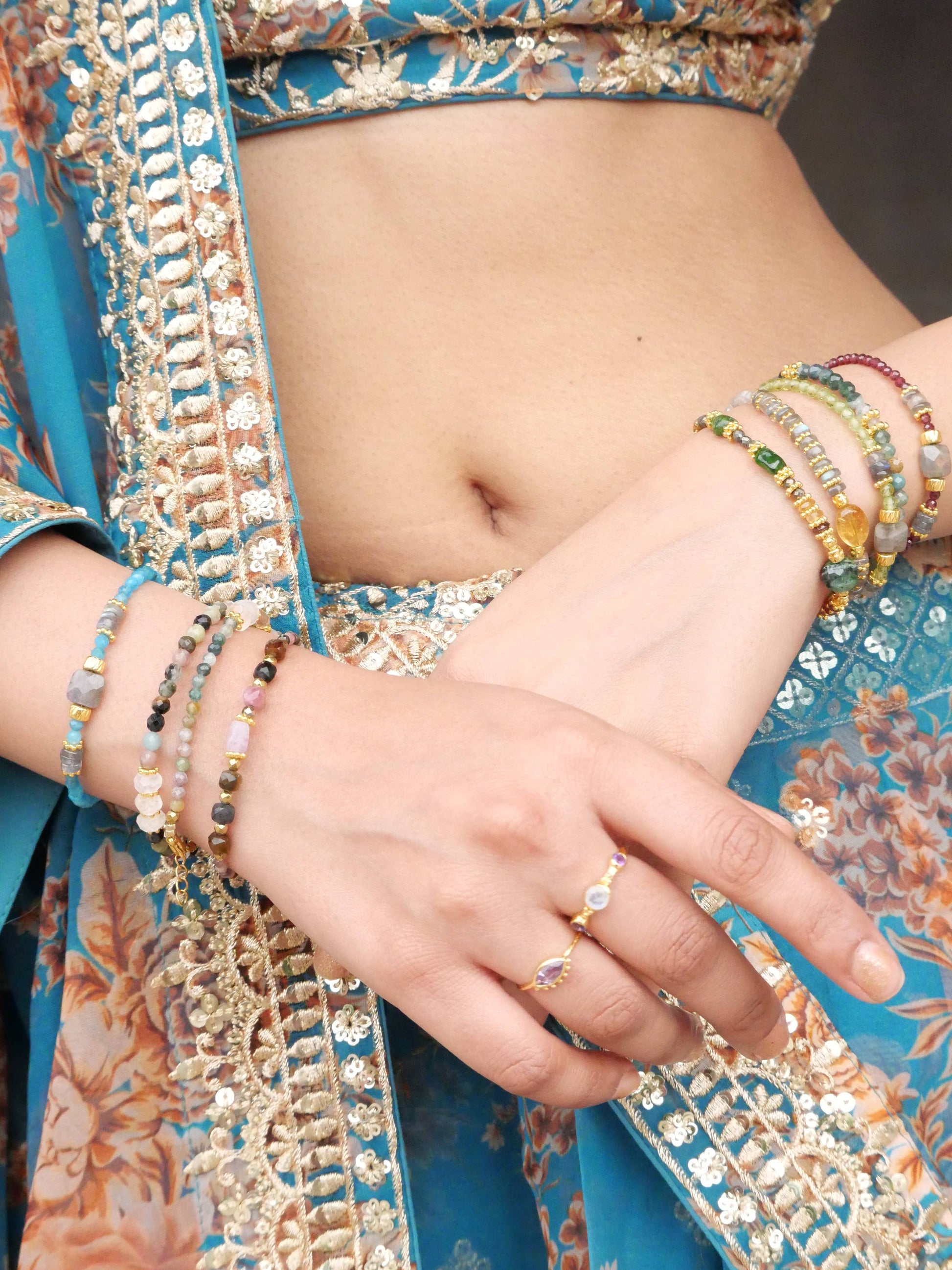 Esta pulsera está elaborada con dijes de amatista, turmalina natural multicolor y detalles en oro, formando una pieza equilibrada y luminosa de estilo bohemio. Su combinación de colores suaves y naturales la convierte en una joya fácil de llevar, ideal tanto para el día a día como para looks de verano.