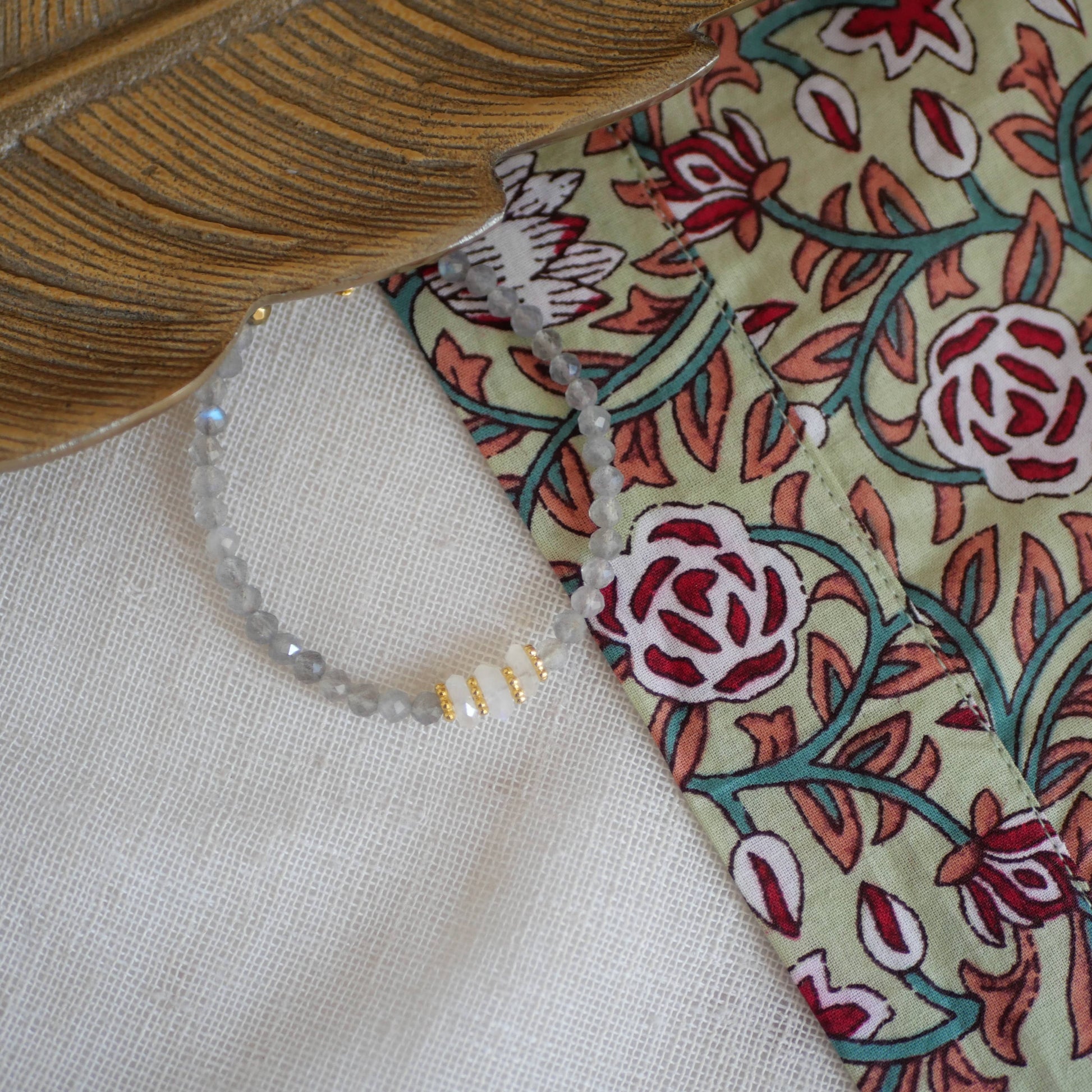 Cada piedra aporta sus propias propiedades energéticas. La piedra solar transmite calidez, motivación y alegría, perfecta para personas que desean aumentar su confianza y vitalidad. La labradorita actúa como escudo protector contra las energías negativas y favorece la estabilidad emocional. La aguamarina invita a la calma, la serenidad y la claridad mental, ayudando a reducir el estrés. En el centro, las piedras lunares conectan con la intuición, la feminidad y el equilibrio interior, completando una pieza cargada de simbolismo y bienestar.