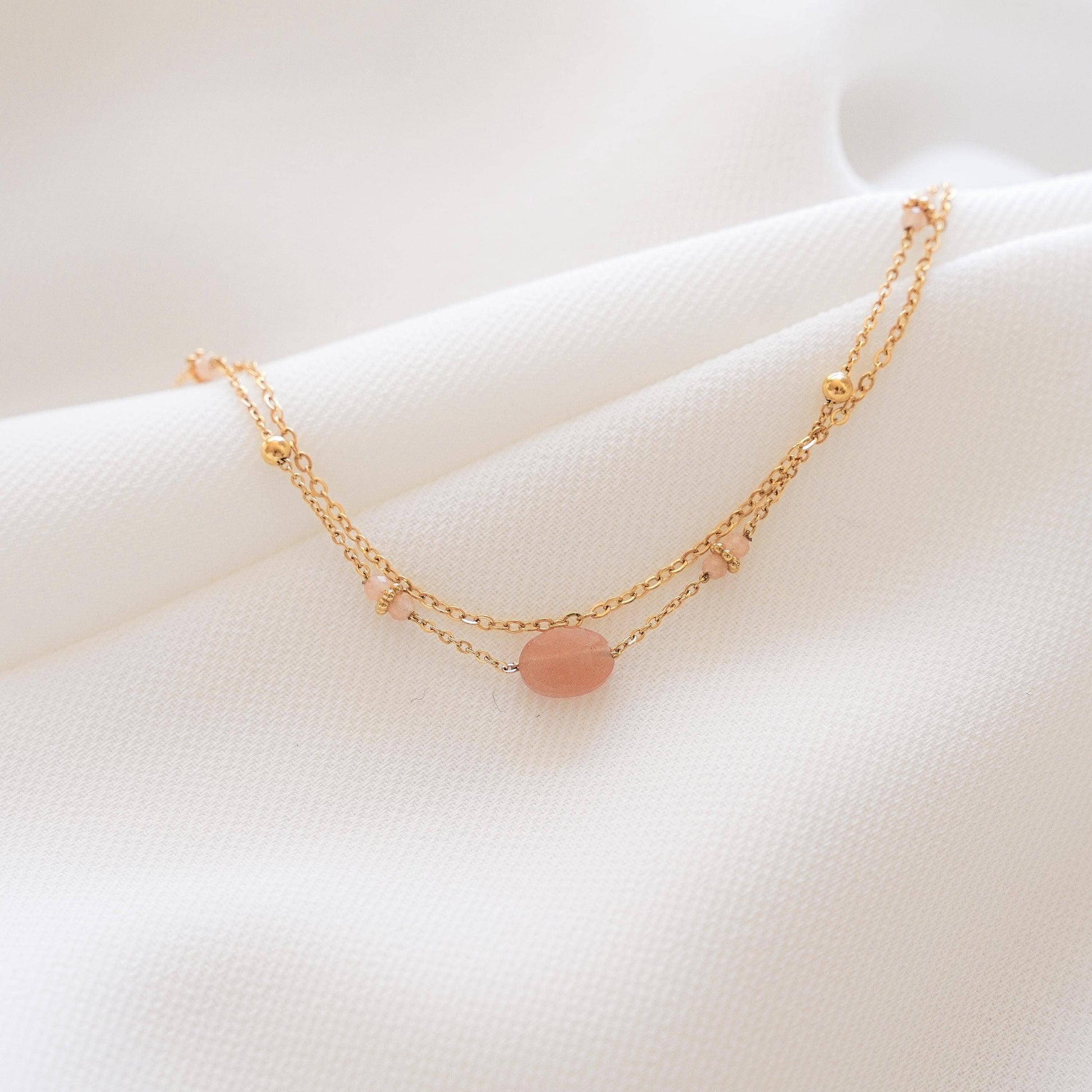 Delicada y femenina, esta pulsera para mujer combina dos finas cadenas de acero inoxidable con una elegante piedra natural ovalada de cuarzo rosa, conocida por simbolizar amor y armonía. Su cadenita de ajuste de 3 cm permite que se adapte perfectamente a cualquier muñeca. Minimalista y versátil, combina de maravilla con otras pulseras doradas y es un regalo ideal.