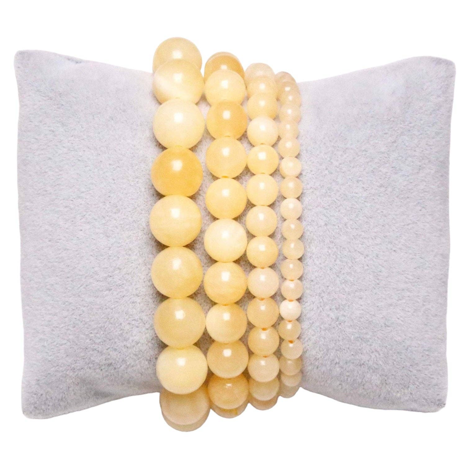 Montada sobre un hilo elástico resistente, está disponible en varios diámetros de perla para adaptarse a cualquier estilo. La calcita utilizada es de calidad A, seleccionada por su color uniforme y su vibración luminosa.