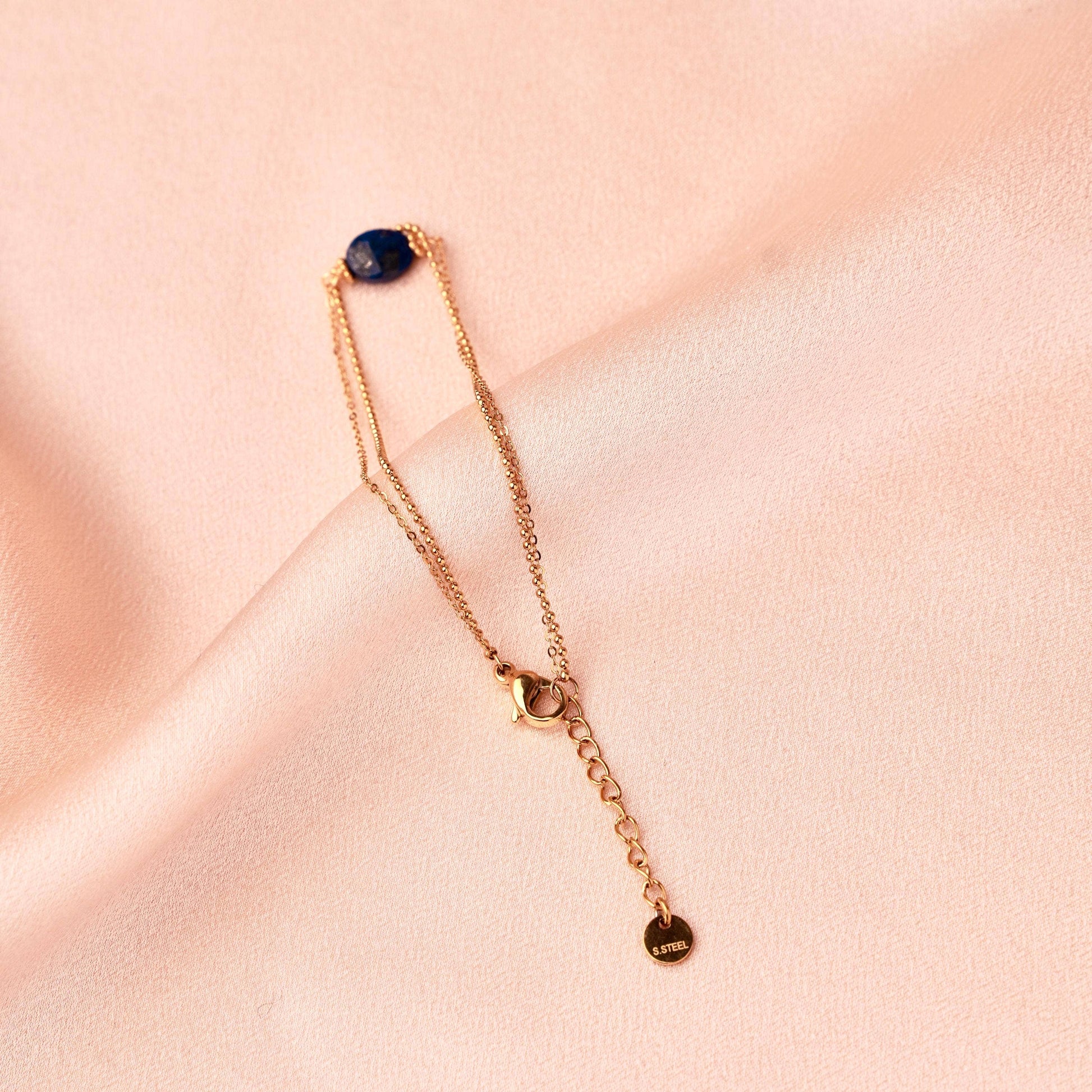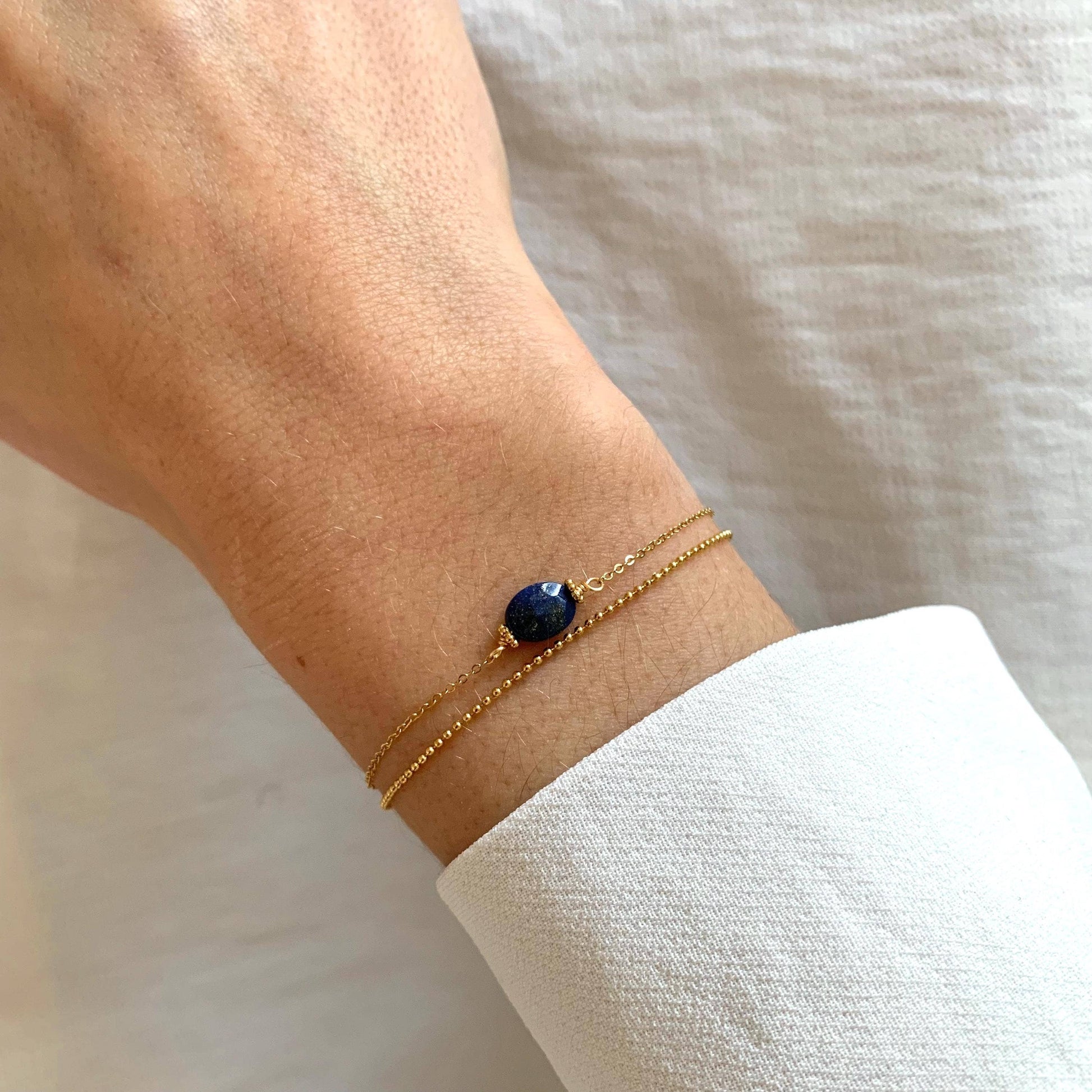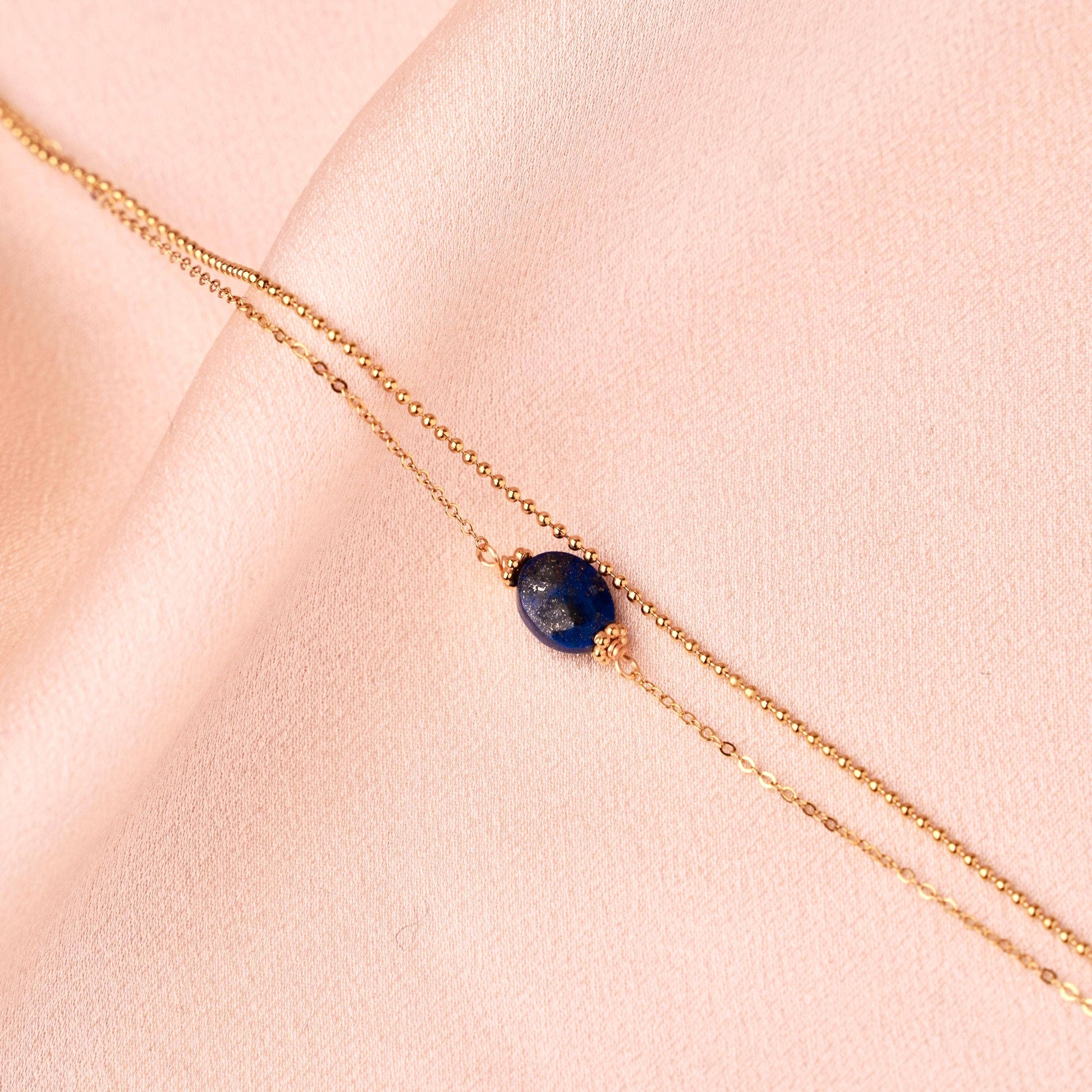 Elegante y sofisticada, esta pulsera para mujer está formada por dos finas cadenas de acero inoxidable y una piedra natural ovalada de lapislázuli, conocida por sus intensos tonos azul profundo. Su cadenita de ajuste de 2,5 cm permite adaptarla perfectamente a cualquier muñeca. Minimalista y versátil, combina de maravilla con otras pulseras doradas, siendo un regalo ideal.