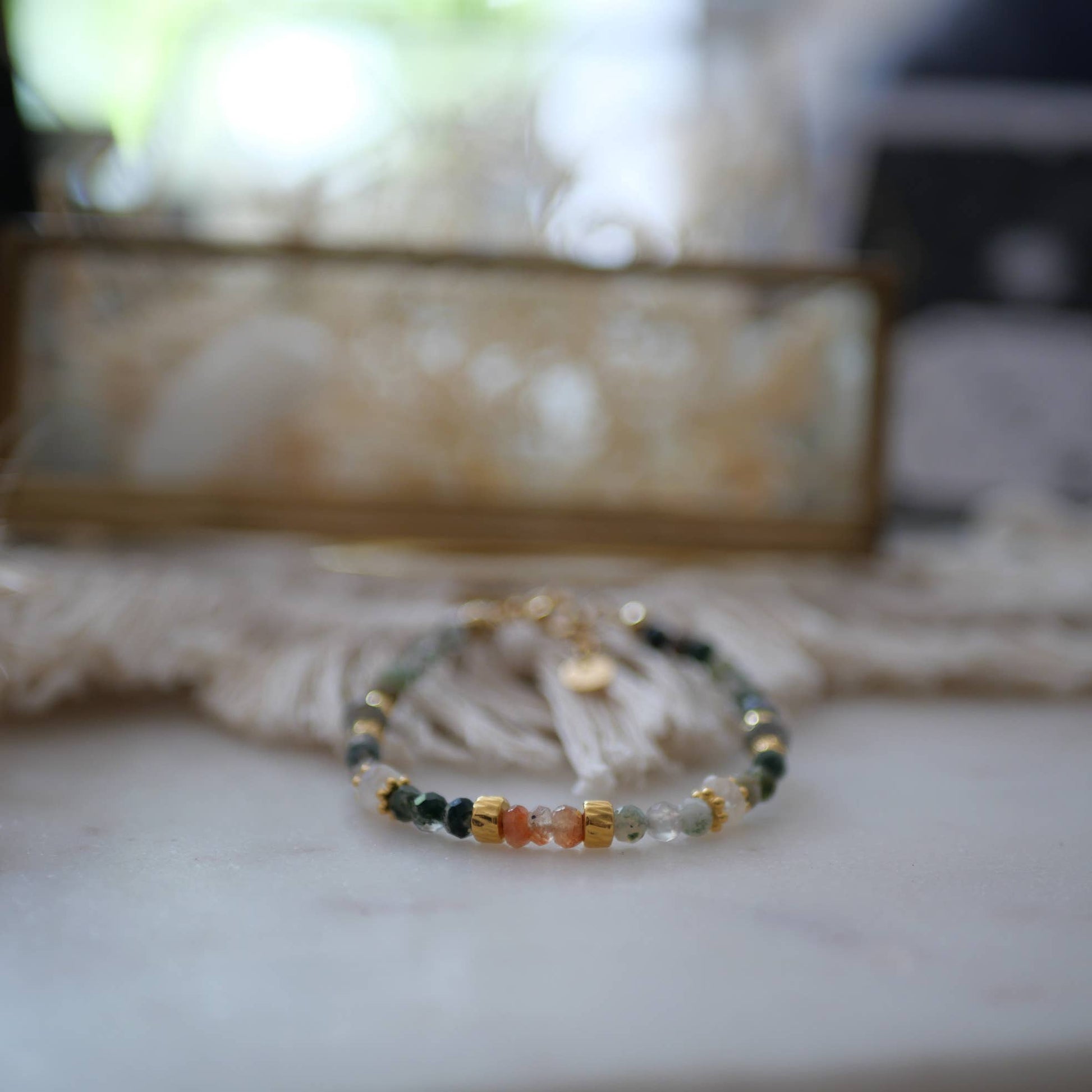 Esta pulsera está elaborada en acero inoxidable y decorada con dijes de ágata india, piedra solar, piedra lunar y detalles chapados en oro. Su combinación de tonos cálidos y naturales da lugar a una pieza bohemia y luminosa, ideal para llevar a diario o como complemento especial en los meses de verano.