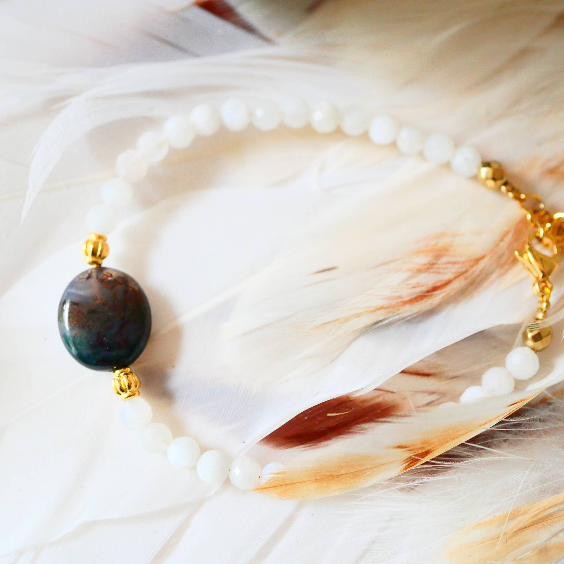 Esta pulsera está elaborada con piedra luna combinada con una ágata musgosa como pieza central y montada sobre cadena de acero inoxidable. Su diseño es delicado y equilibrado, con tonos suaves que aportan luminosidad y un aire natural, ideal para llevar a diario o como complemento sutil en looks más cuidados.