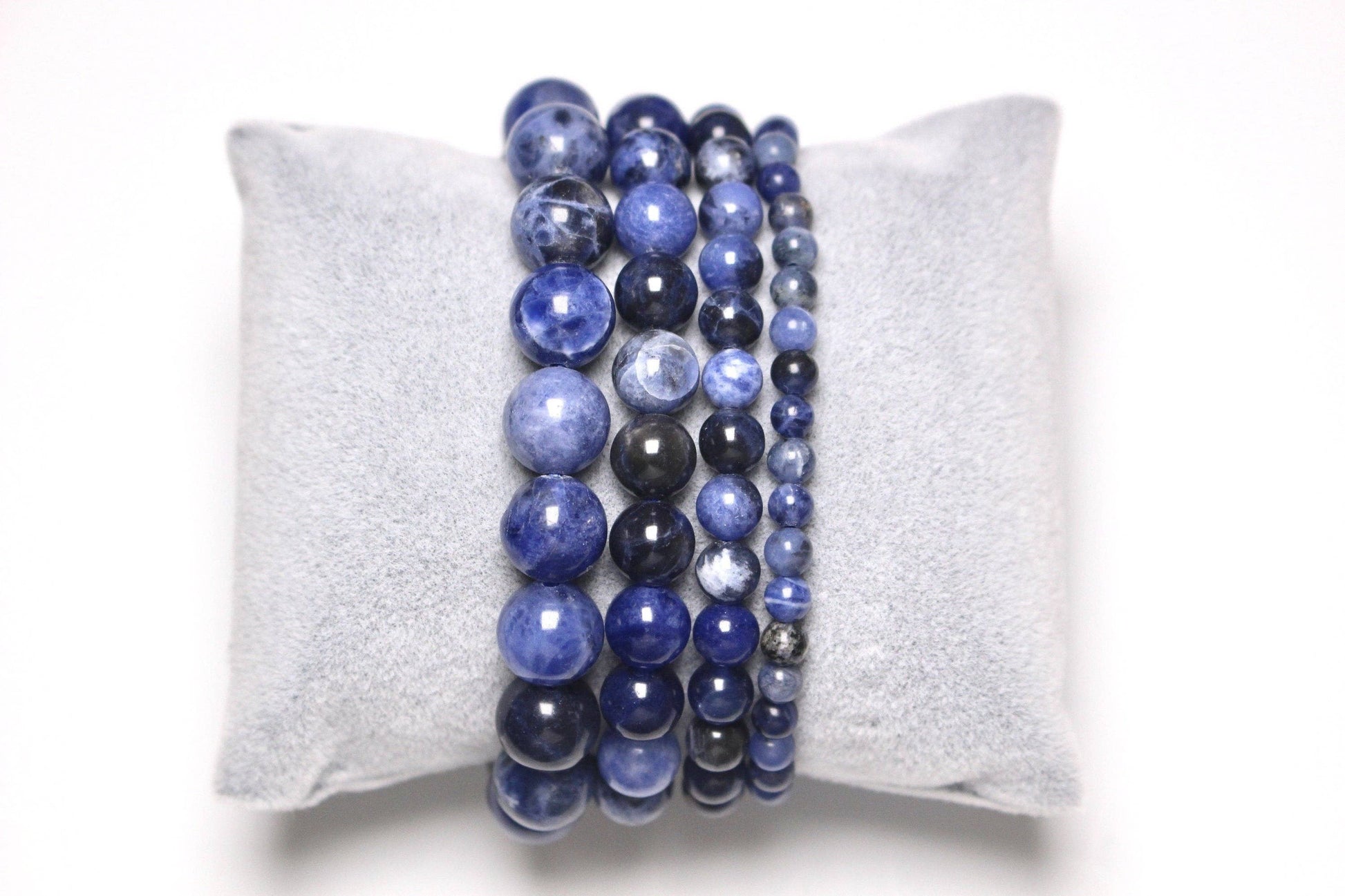 Pulsera elaborada con piedras naturales de sodalita procedentes de Brasil. Su diseño de cuentas redondeadas destaca por los tonos azul intenso con vetas blancas características de esta gema, asociada con la calma, la intuición y la claridad mental.