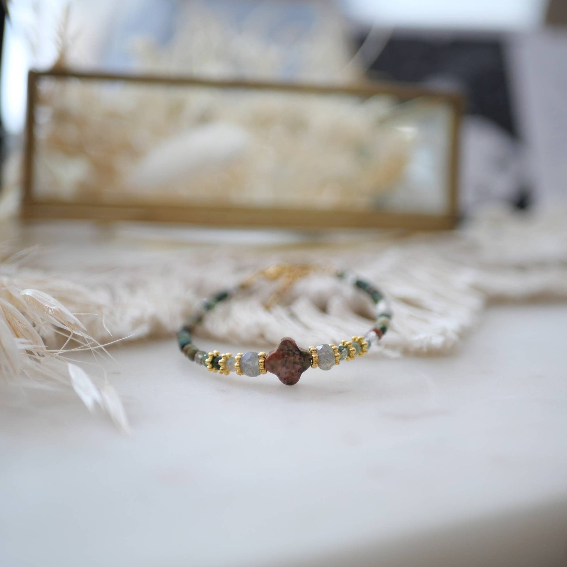 Cada mineral aporta una energía única: la unakita favorece el equilibrio emocional, la labradorita potencia la intuición y la protección personal, y la ágata india aporta calma y estabilidad interior. Un diseño armonioso con un estilo delicado y femenino, perfecto para el día a día o para combinar con otras pulseras.